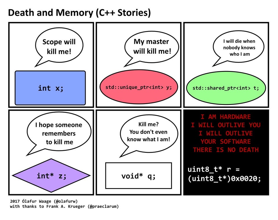 More seriously, every programmer should have a notion of how memory is managed by the language he uses, so that we would understand what is going when the program has a problem with memory management. And more especially C++ developer, since all those tools, the smart pointers are available to us, we should definitely use the one that match perfectly our needs in each situation.